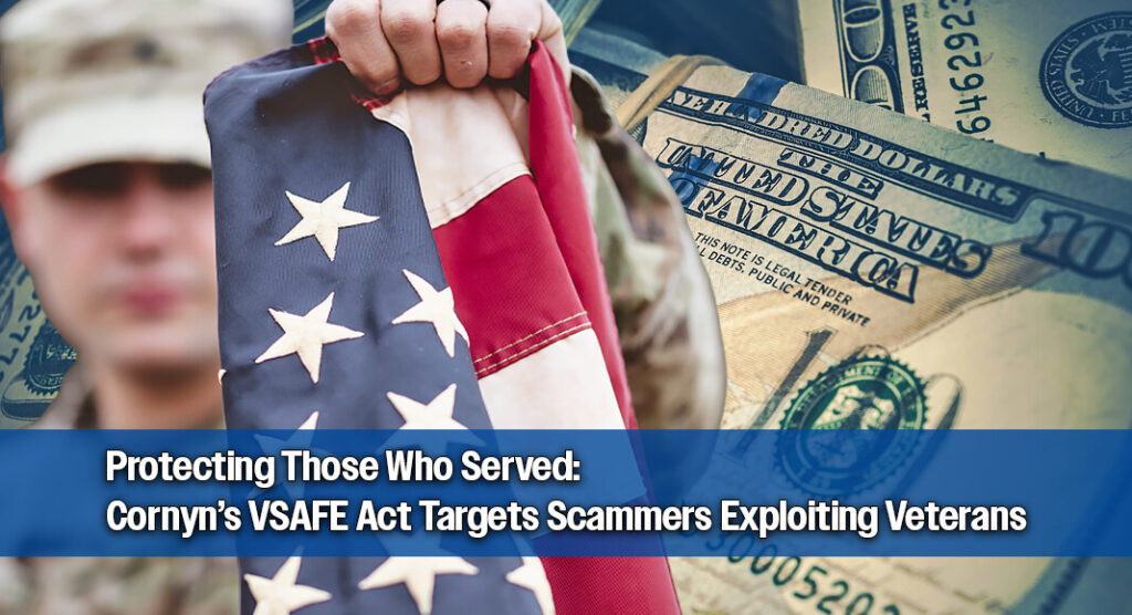 Texas Border Business WASHINGTON – El senador estadounidense John Cornyn (R-TX) presentó el Acta de Protección a los Contribuyentes Estadounidenses, un paquete legislativo integral para recuperar fondos robados, proteger el dinero de los contribuyentes y detener a los estafadores. Este incluye su Acta de Estafas y Evasión de Fraude contra Veteranos (VSAFE), que establecería un Oficial de Estafas y Evasión de Fraude contra Veteranos en el Departamento de Asuntos de Veteranos (VA) de los Estados Unidos: El artículo completo sobre la iniciativa del Senador Cornyn para recuperar $240 mil millones en fondos robados apareció en Texas Border Business.