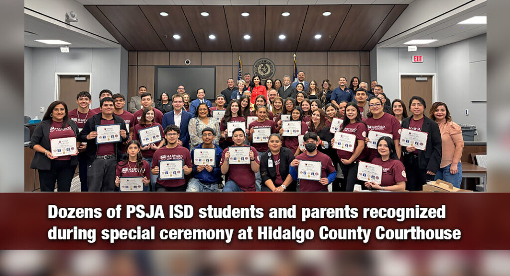 Docenas de estudiantes y padres del Distrito Escolar Independiente de Pharr-San Juan-Alamo (PSJA ISD) fueron reconocidos el 24 de abril de 2026 en el Tribunal del Distrito 370 por haber completado con éxito el Programa Zero-L de la Escuela de Derecho de Harvard, un riguroso curso de educación legal ofrecido a través de una colaboración única entre el Departamento de Sustentabilidad de PSJA ISD, la Escuela de Derecho de Harvard y el Condado de Hidalgo.